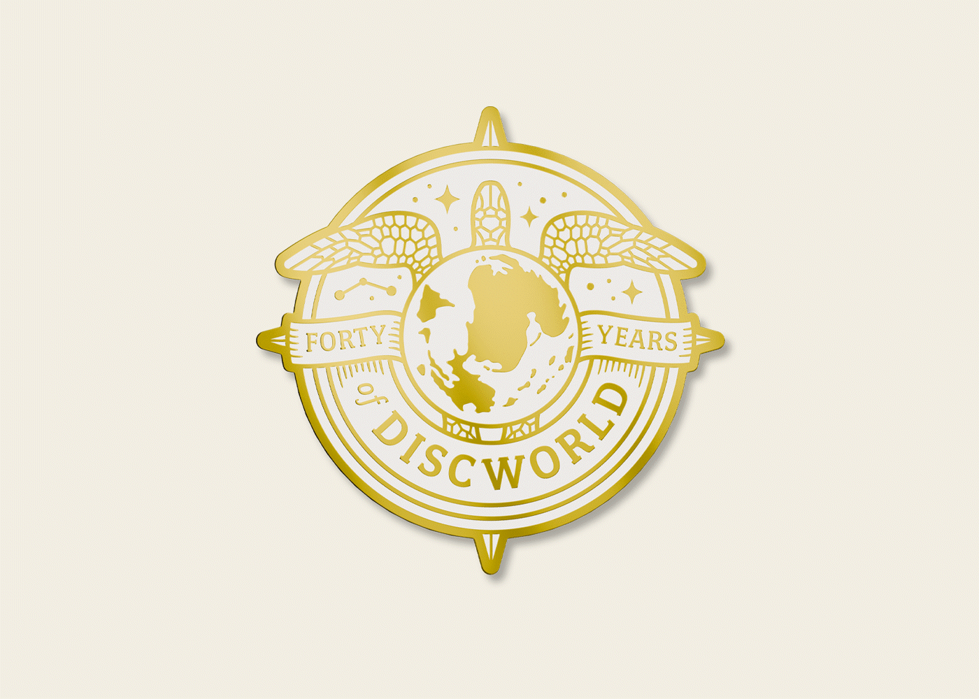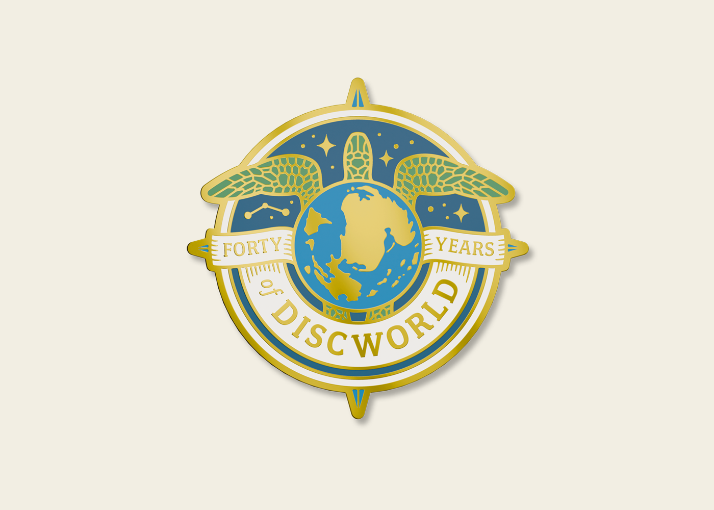 Enamel Pin design to mark the 40th Anniversary of Terry Pratchett's Discworld. Plus a glow in the dark variant.