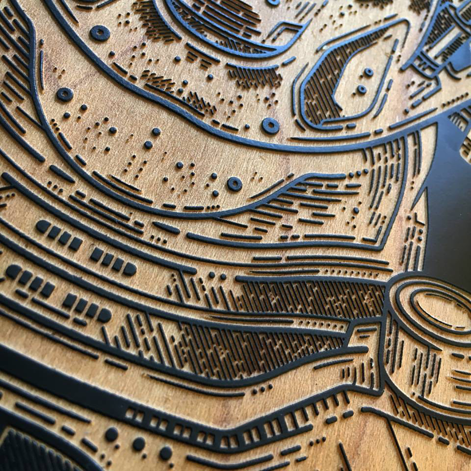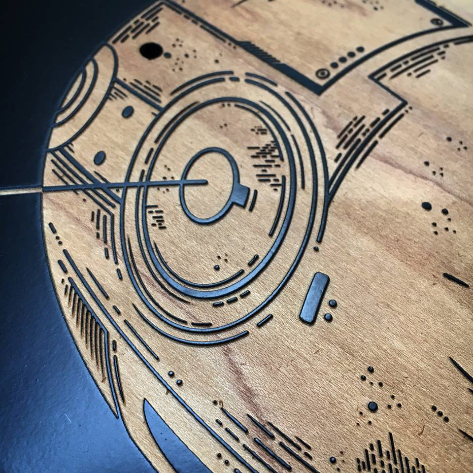 Laser etched skateboard graphic for 'Treading the Boards' 2017. A Cardiff exhibition.